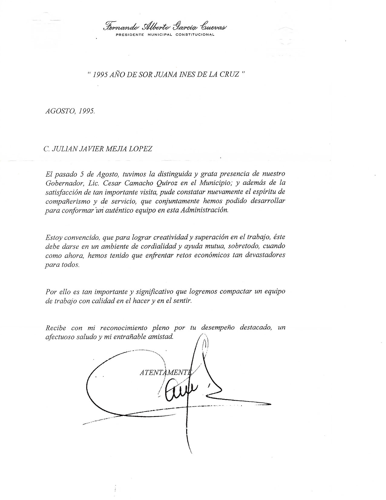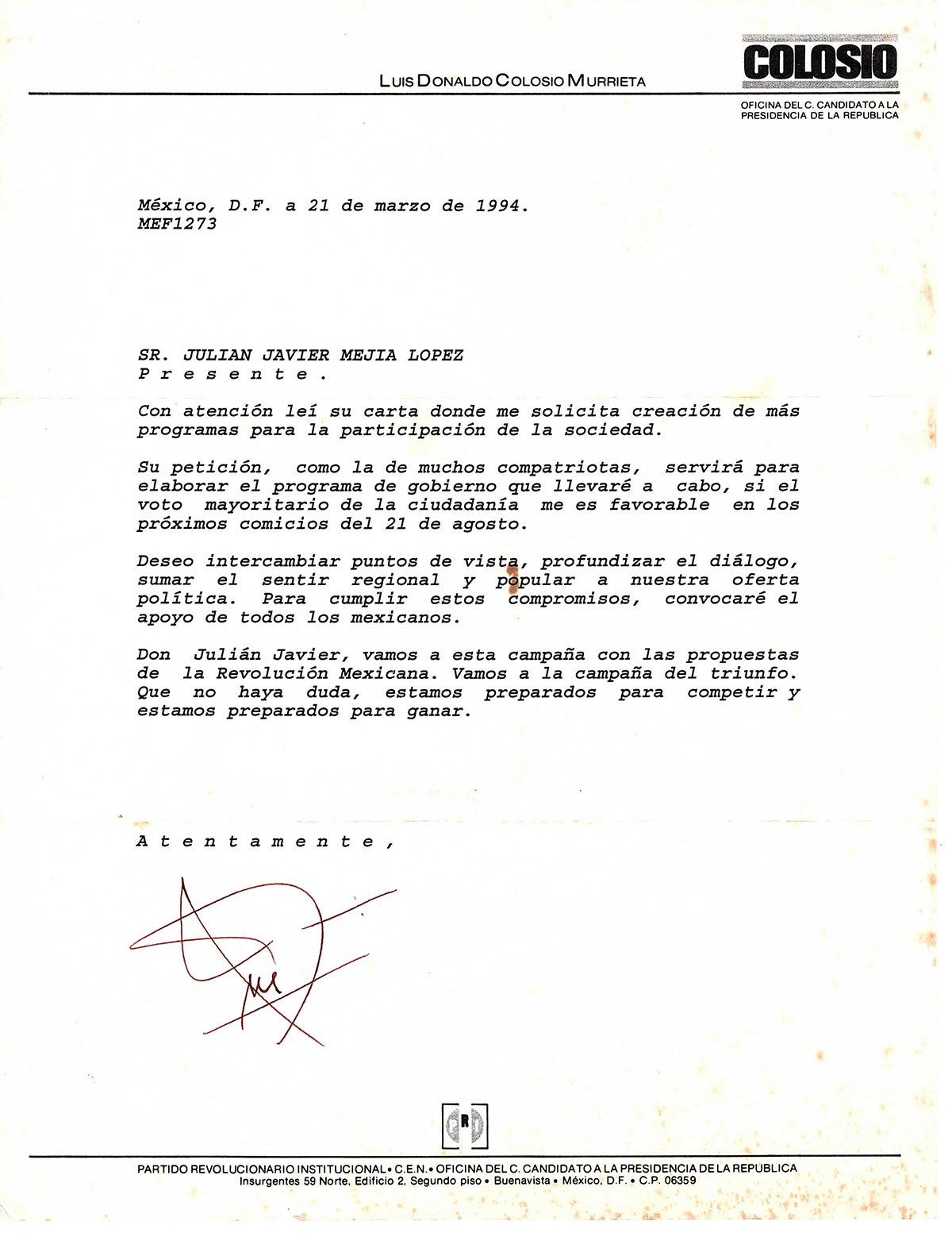 Cobra relevancia destacar que dentro de las múltiples gestiones que realice, se encuentran una serie de peticiones que formule al entonces Candidato a la Presidencia de la República, Luis Donaldo Colosio Murrieta, quien en respuesta a ellas, días antes de su homicidio firmó en forma autógrafa un documento en el que me expresó su deseo de intercambiar puntos de vista y dialogar conmigo; sin embargo, todos sabemos lo ocurrido.