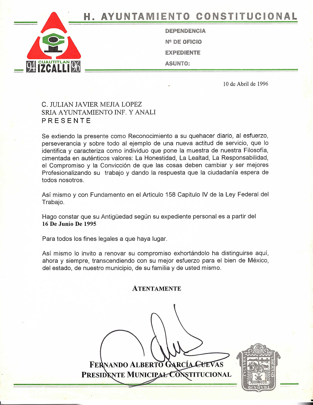A lo largo de mi vida se me ha brindado la oportunidad de desempeñar diversos encargos dentro de la administración pública, de carácter electoral, en el ejido y en mi comunidad, que, sin duda, pe han permitido contribuir en algo, para el beneficio del pueblo; los cuales desempeñé con mucho orgullo y satisfacción.